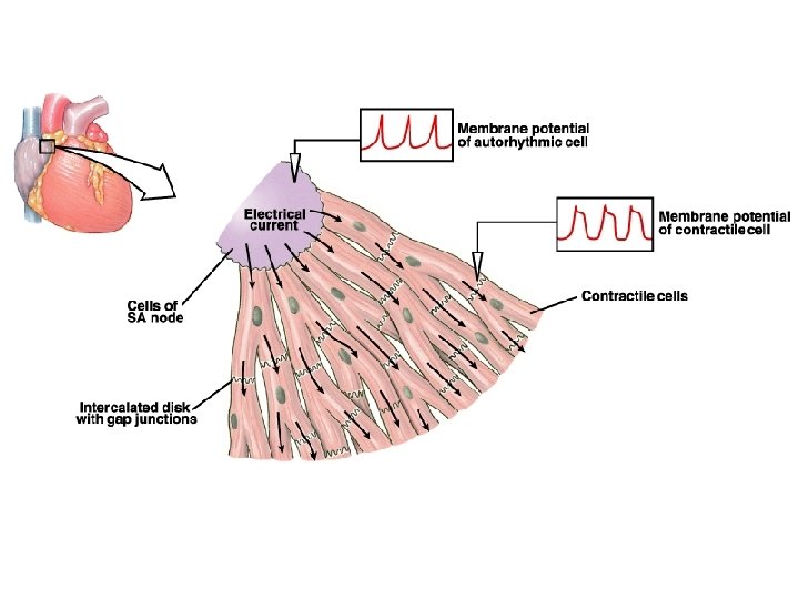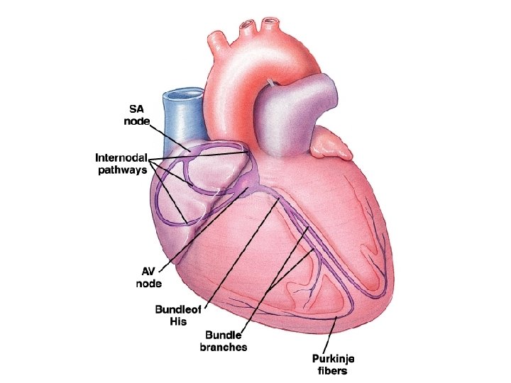 Electrical conduction in the Heart • The Sinoatrial node (SA node), is a group of autorhythmic cells (main pacemaker of the heart) in the right atrium near the entry of the superior vena cava. • An internodal pathway connects the SA node to the atrioventricular node (AV node), a group of autorhythmic cells found near the floor of the right atrium. • From the AV node action potentials move into fiber known as the bundles of his or atrioventricular bundle. The bundle passes from the AV node into the wall of the septum between the ventricles. • A short way down the septum the bundle divides into left and right bundle branches. • These fibers continue downward to the apex where they divide into many small purkinje fibers that spread outward among the contractile cells.