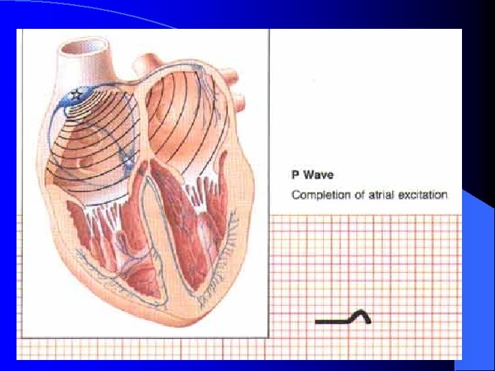 The P wave l The first wave form is called a P wave: it represents Atrial depolarization. l It is gently rounded, and not larger than 2 -3 mm. l It is usually positive (above the isoelectric line) l It should not be large, notched, or peaked