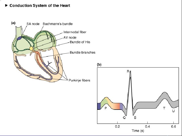 Electrical Events of the Cardiac Cycle Sinoatrial (SA) node is the normal pacemaker of heart and is located in right atrium. • Depolarization spreads from SA node across atria and results in the P wave. • Three tracts within atria conduct depolarization to atrioventricular (AV) node. • • Conduction slows in AV node to allow atria to empty blood into ventricles before vent. systole. Bundle of His connects AV to bundle branches. • Purkinje fibers are terminal bundle branches. •