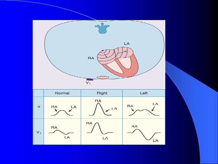 Left Atrial Abnormality Right Atrial Abnormality Prolonged P wave duration >120 msec in lead II Peaked P waves with amplitudes in lead II >0. 25 m. V (P pulmonale) Prominent notching of the P wave, usually most Rightward shift of the mean P wave axis to obvious in lead II, with an interval between the above +75 degrees notches of >40 (P mitrale) Ratio between the duration of the P wave in lead Increased area under the initial positive portion II and the duration of the PR segment >1. 6 of the P wave in lead V 1 to >0. 06 mm-sec Increased duration and depth of the terminal negative portion of the P wave in lead V 1 (the P terminal force) so that the area subtended by it exceeds 0. 04 mm-sec Leftward shift of the mean P wave axis to between -30 and -45 degrees