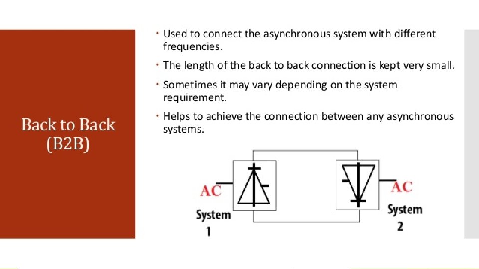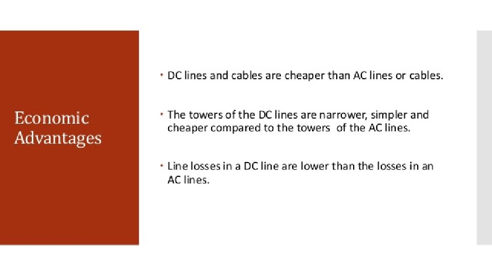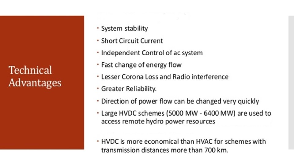 Cont… HVDC also allows transfer of power between grid systems running at different frequencies, such as 50 Hz and 60 Hz. This improves the stability and economy of each grid, by allowing exchange of power between incompatible networks. Better voltage utilization rating