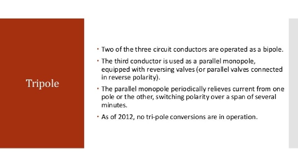 Hisrory: The development of direct current (DC) transmission dates back to the 1930’s in Sweden and in Germany, and has been a proven technology since the first major installations in 1954. Over the last 40+ years, DC projects have shown to offer significant electrical, economic, and environmental advantages when transporting power across long distances. Early commercial installations included one in the Soviet Union in 1951 between Moscow and Kashira, and a 100 k. V, 20 MW system between Gotland mainland Sweden in 1954. The longest HVDC link in the world is currently the Xiangjiaba–Shanghai 2, 071 km (1, 287 mi), ± 800 k. V, 6400 MW link connecting the. Xiangjiaba Dam to Shanghai, in the People's Republic of China. Early in 2013, the longest HVDC link will be the Rio Madeira link in Brazil, which consists of two bipoles of ± 600 k. V, 3150 MW each, connecting Porto Velho in the state of Rondônia to the São Paulo area, where the length of the DC line is 2, 375 km (1, 476 mile).