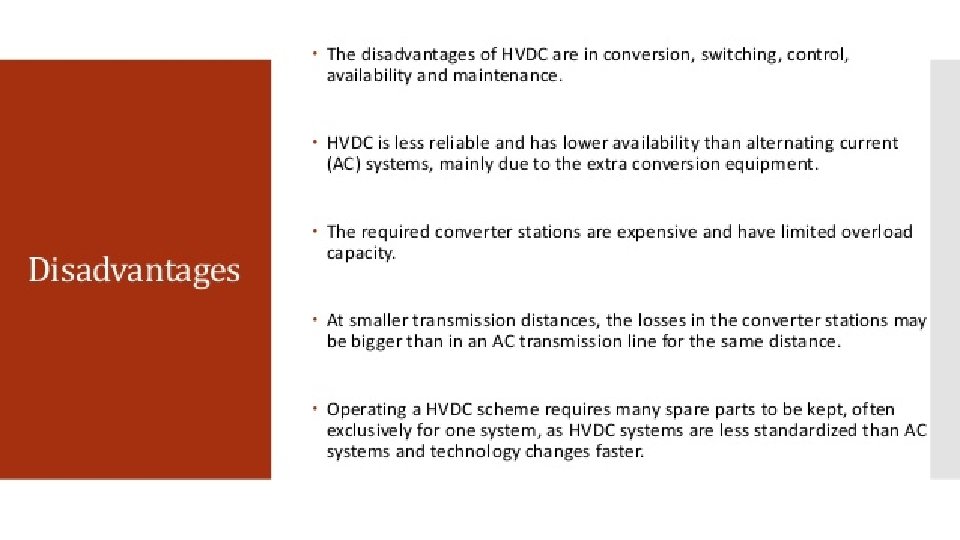 Disadvantages: (expensive) Converter stations needed to connect to AC power grids are very expensive. Converter substations generate current and voltage harmonics, while the conversion process is accompanied by reactive power consumption. As a result, it is necessary to install expensive filter-compensation units and reactive power compensation units. (complex) In contrast to AC systems, designing and operating multi-terminal HVDC systems is complex. (capacities) The number of substations within a modern multi-terminal HVDC transmission system can be no larger than six to eight, and large differences in their capacities are not allowed. it is practically impossible to construct an HVDC transmission system with more than five substations. (difficult grounding) Grounding HVDC transmission involves a complex and difficult installation, as it is necessary to construct a reliable and permanent contact to the Earth for properation and to eliminate the possible creation of a dangerous “step voltage. ” (power faults) During short-circuits in the AC power systems close to connected HVDC substations, power faults also occur in the HVDC transmission system for the duration of the short-circuit. Inverter substations are most affected.
