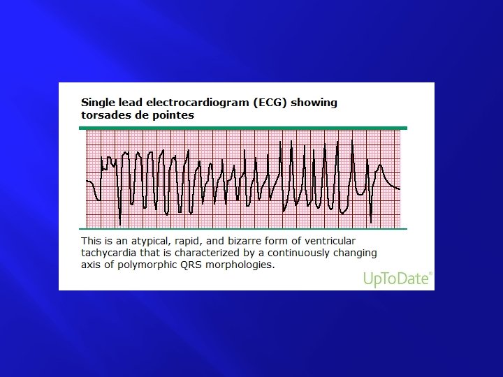 � � Arrhythmias with a polymorphic QRS appearance (such as torsades de pointes) will usually not permit synchronization. Thus, if a patient has polymorphic VT, treat the rhythm as VF and deliver high-energy unsynchronized shocks (ie, defibrillation doses). If there is any doubt whether monomorphic or polymorphic VT is present in the unstable patient, do not delay shock delivery to perform detailed rhythm analysis: provide high-energy unsynchronized shocks (ie, defibrillation doses).