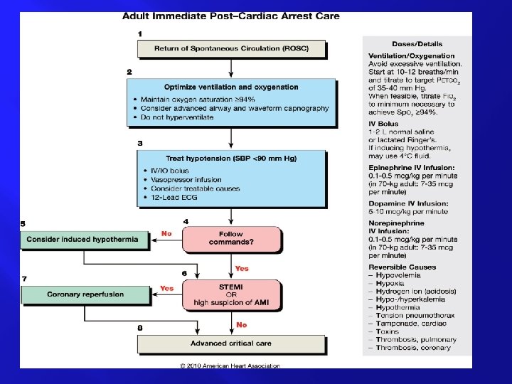 � Subsequent objectives of post– cardiac arrest care to � ● Control body temperature to optimize survival and neurological recovery ● Identify and treat acute coronary syndromes (ACS) ● Optimize mechanical ventilation to minimize lung injury ● Reduce the risk of multiorgan injury and support organ function if required ● Objectively assess prognosis for recovery ● Assist survivors with rehabilitation services when required � � �