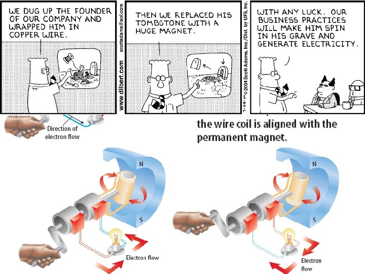 We have seen how electricity can produce a magnetic field, but a magnetic field can also produce electricity! How? What is electromagnetic induction? Moving a loop of wire through a magnetic field produces an electric current. This is electromagnetic induction. A generator is used to convert mechanical energy into electrical energy by electromagnetic induction. Carefully study the next diagrams: