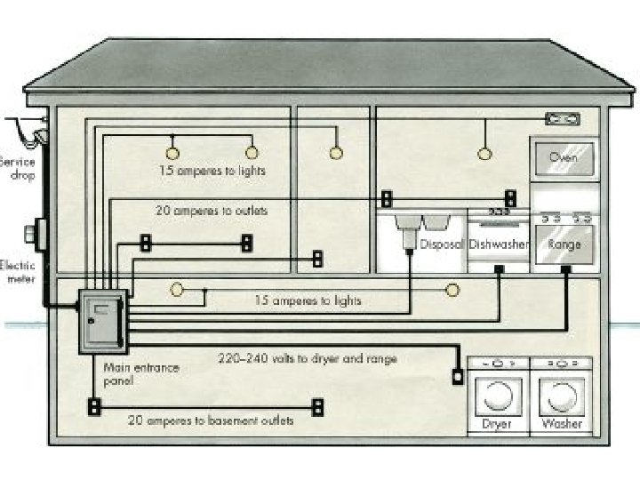 Household Circuits: • Although you can’t see it, the wiring in a house is composed mostly of a combination or very organized parallel circuits. – Electrical currents enter conventional homes through overhead or underground wires. • They first pass through a meter to monitor your energy use. • From the meter, wires are connected to your breaker box. • The wires then branch out to the rest of your house.