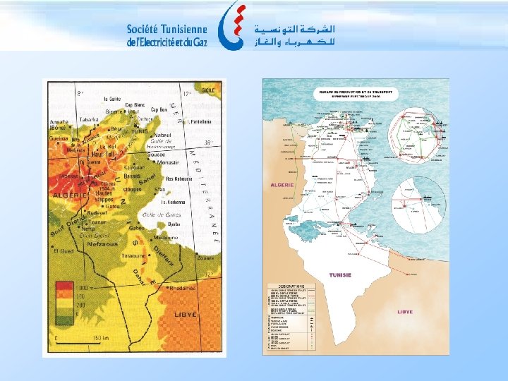 STEG - 2003 Personnel Nombre de consommateurs Chiffre d’affaire 9442 employés HT= 16; MT=12 842. BT= 2 513 153; Gas= 182973 Consommateurs 903 MDT Pointe 2010 MW Energie produite STEG: 8302 GWh IPP: 2599 GWh Longueur des HT= 4585; MT=47 826. BT= 79 329 réseaux (km) km