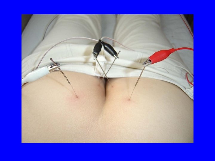 • 3. Electrical pudendal nerve stimulation • In this therapy, four sacral specific points are acupunctured by a special needling method (the needle tip in a specific direction) and electrified • 3. 电针阴部神经刺激疗法 • 该疗法对骶部四个特定穴位采用特殊针 刺方法(针尖向特定方向)并加以电刺 激