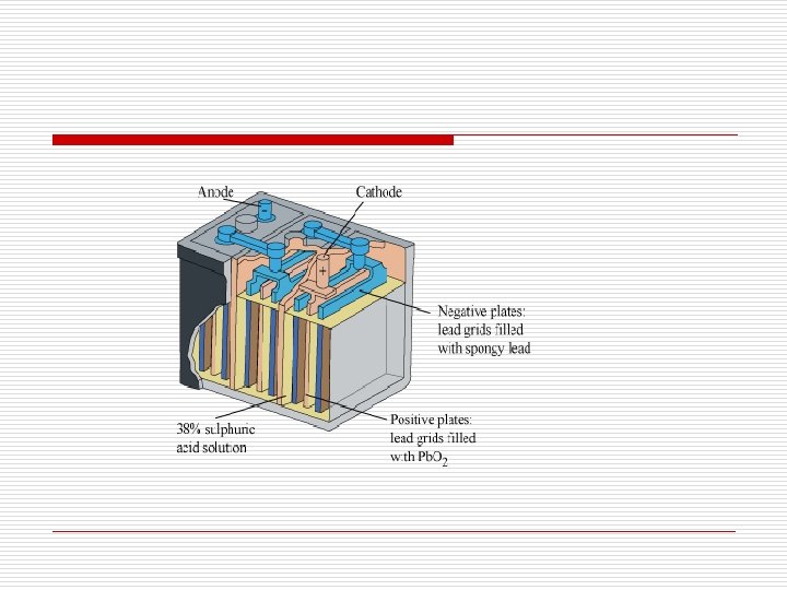 Lead storage battery o Commonly used in automobiles and invertors o Anode → Lead o Cathode is a grid of lead packed with Pb. O 2 o Electrolyte is 38% solution of H 2 SO 4