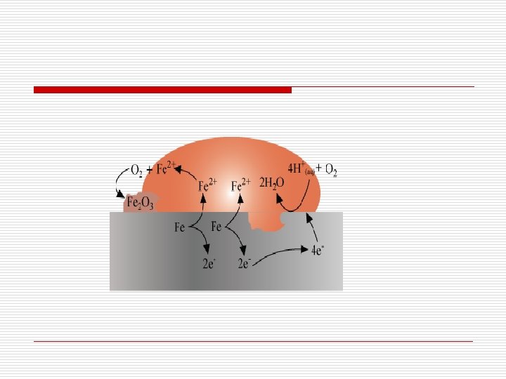 o Sources of H+ ions may be o H 2 CO 3, formed due to the dissolution of CO 2 from air into water o Water, formed due to the dissolution of other acidic oxides from atmosphere o The overall reaction is o The Fe 2+ ions thus formed are further oxidised by atmospheric oxygen to Fe 3+ ions, and finally, it comes out as rust.