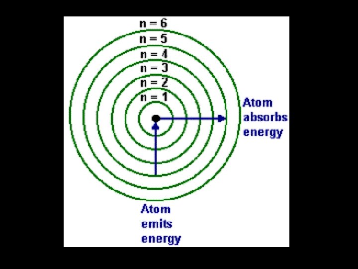 Postulates of Bohr model • Electrons can have only certain specific values of energy. • Electrons travel in fixed, circular orbits* • When an electron absorbs the exact difference in energy between 2 levels it makes a quantum leap up • When an electron makes a quantum leap down it releases the exact difference in energy between two levels. • * = we no longer believe this postulate