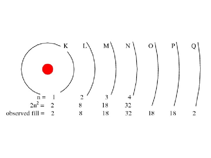 Principle Quantum Number (n) or Energy Level • values 1 -7 used to specify the level the electron is in • describes how far away from the nucleus the electron level is – the lower the number, the closer the level is to the atom's nucleus and less energy • maximum # of electrons that can fit in an energy level is given by formula 2 n 2 (n = energy level)