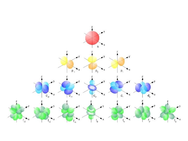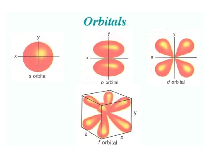 • Orbitals grouped in s, p, d, and f orbitals (sharp, proximal, diffuse, and fundamental) s orbitals d orbitals p orbitals f orbitals