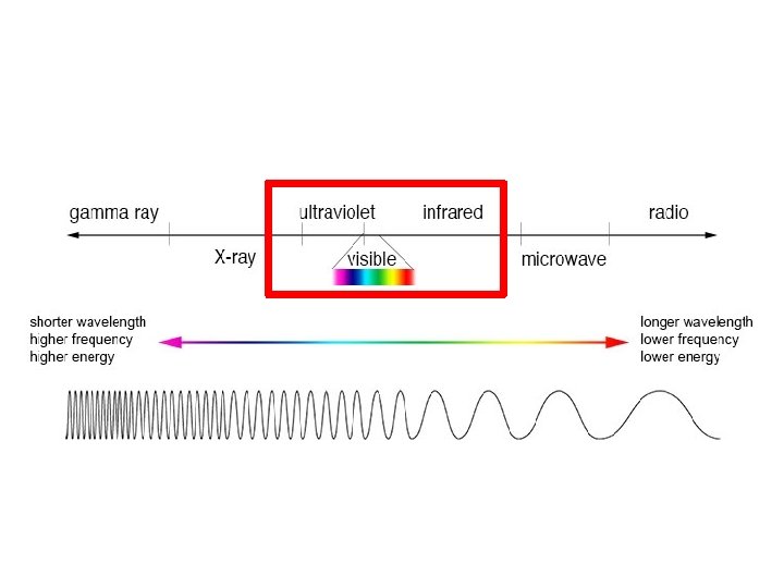 The Electromagnetic Spectrum Know what is in the red boxes High frequency lower frequency Short wavelength longer wavelength High energy lower energy