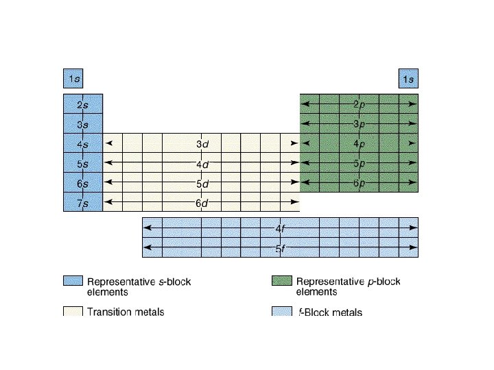 • exceptions (don’t need to know this, just be aware that there are exceptions) • orbitals “like” to be empty, half filled, or full • therefore, an electron leaves the 4 s (leaving it half full) and goes to the 3 d in order to make it full Cr we would predict: 1 s 2 2 p 6 3 s 2 3 p 6 4 s 2 3 d 4 but it is actually: 1 s 2 2 p 6 3 s 2 3 p 6 4 s 13 d 5 Cu we would predict: 1 s 2 2 p 6 3 s 2 3 p 6 4 s 2 3 d 9 but it is actually: 1 s 2 2 p 6 3 s 2 3 p 6 4 s 1 3 d 10
