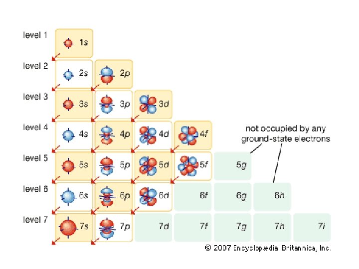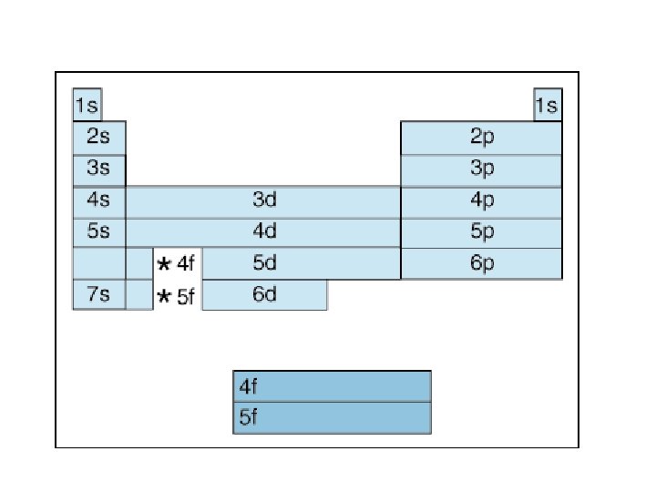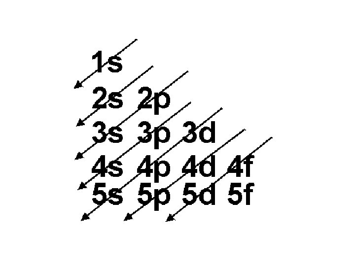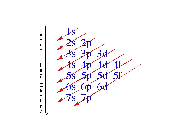 4 f 14 (7) 4 d 10 (5) 4 p 6 (3) 4 s 2 (1) 32 = level and sub-level = max. # of electrons = number of orbitals 3 d 10 (5) 3 p 6 (3) 3 s 2 (1) 18 2 p 6 (3) 2 s 2 (1) 8 1 s 2 (1) 2