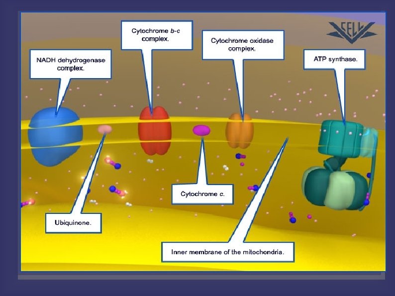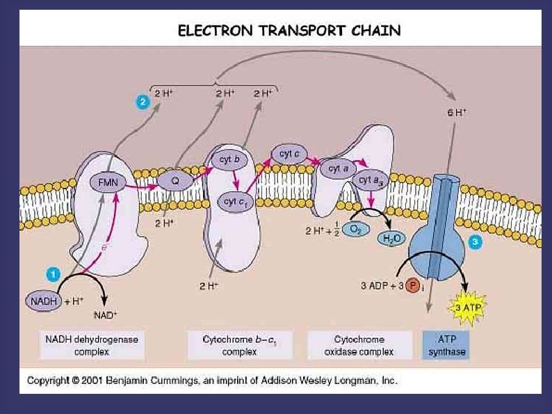 ELECTRON TRANSPORT CHAIN Steps: NADH, from pyruvate oxidation and the Krebs Cycle, gives up its two electrons to NADH dehydrogenase, The mobile carriers Q and cytochrome c shuttle electrons from one protein complex to the next until they reach the cytochrome oxidase complex (final acceptor). Each protein complex (3) also acts as a proton pump, using the free energy released to move protons from the matrix to the intermembrane space. At the cytochrome oxidase complex, cytochrome oxidase, catalyzes the reaction between the electrons, protons and oxygen to form water. (2 H+ + 1/2 O 2 --> H 2 O) This process is highly exergonic (giving up free energy of 222 k. J/mol). The chemical potential energy of the electron position is converted to the electrochemical potential energy of a proton gradient that forms across the inner mitochondrial membrane. High concentration in the intermembrane space, low concentration in the matrix. The proton gradient will be used to produced ATP.