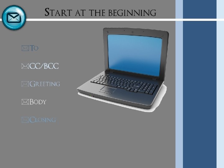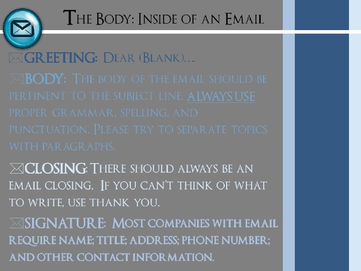 Body § Write so emails are easy to read § Make paragraphs 7 -8 lines § Insert a blank line between paragraphs § Use headlines, bullets, and numbers § AVOID ALL CAPS; THAT’S SHOUTING § If a message is longer than 3 screens, send an attachment