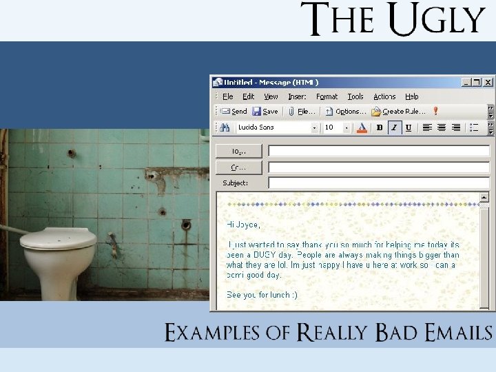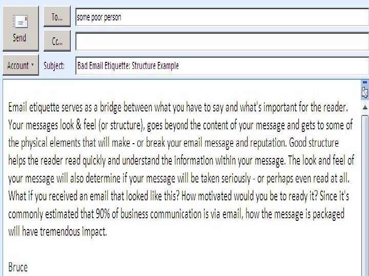 Anatomy of an email: Body § Before you hit Send, review and delete § § § Negative comments about management Criticisms of staff or performance issues Bonuses or salary issues Product or liability issues Gossip Humor or other ambiguities Booher