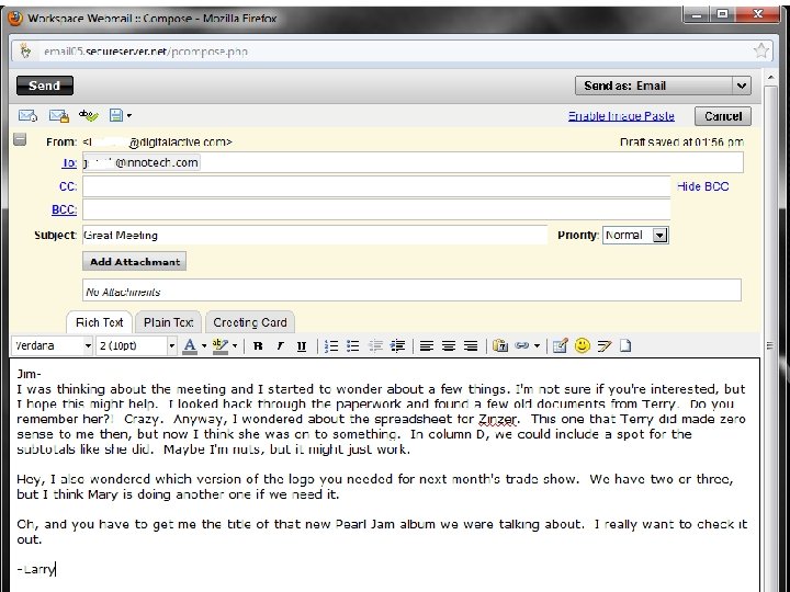 Tip: What not to do • One of the officers convicted of beating Rodney King sent this email: Oops. I haven’t beaten anyone so bad in a long time. A transcript of the message was used at his trial.