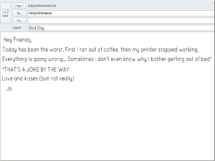 Humor: Often misinterpreted § Participants [in recent studies] were able to accurately communicate humor and sarcasm in barely half -56 percent -- of the emails they sent. Louise Dobson (2006)
