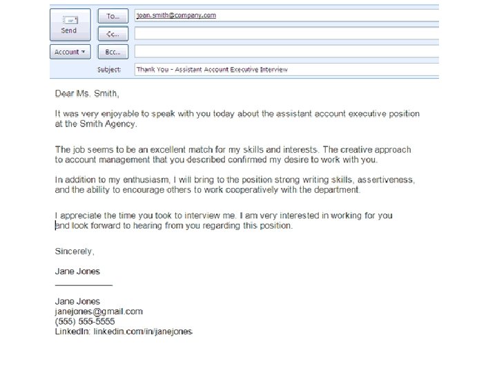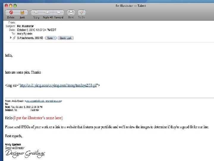 Replying Example Subject: RE: Your February conference presentation Message: Hi Dan, I’m glad to hear that you enjoyed the presentation. I am happy to provide you with a copy of my presentation. Please see the attached Power. Point document. Other people working in this same area are John Smith at Johns Hopkins and Paula Brewer at the University of Minnesota. I suggest starting with Smith’s, “What you can’t see can hurt you” in the journal Nature (April, 2005). If you have any questions, let me know. Sincerely, Taejin Park, Ph. D. Associate Professor Department of Biology Sears University Biology Bldg 6666 Eastern Ave. Robuck, AZ. 32232 Phone: 416 -555 -7543 Cell: 416 -555 -8245 Fax: 416 -555 -2456 Email: tjpark@sears. edu Web: http: //www. sears. edu/~tjpark
