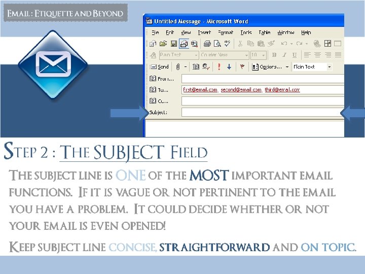 More Tips: Subject §Double-check the address line before sending. §Insulted by a general email from the boss, an employee sent an angry comment to a colleague (she thought): “Does she think we’re stupid? ” § The reply (from her boss): “Yes, I do. ”