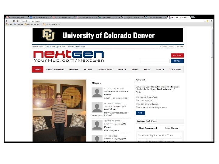 www. Next. Gen. Your. Hub. com • A site for 4 th – 8 th grade students in Colorado • Registered users post stories to web • All stories posted appear online • The best stories are chosen for print in Colorado Kids.