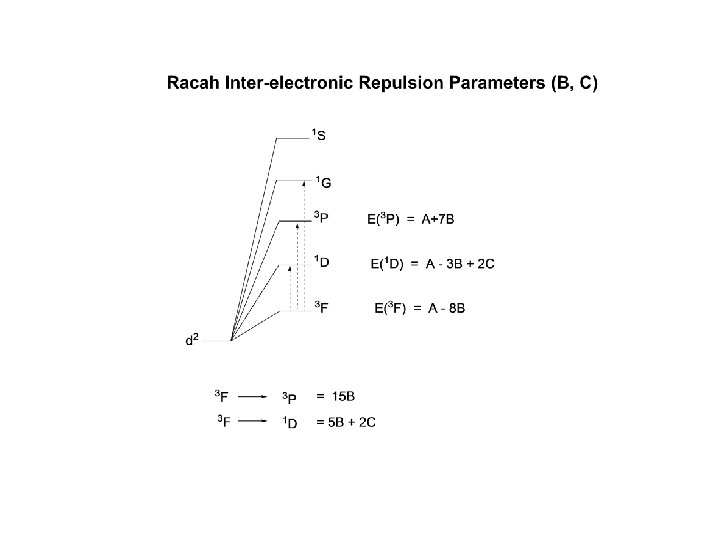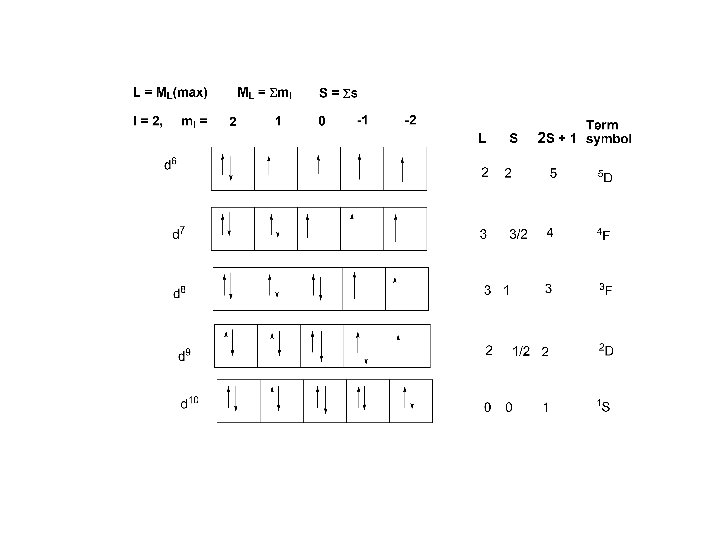 Individual electron l = 2, ml = 2, 1, 0, -1, -2 Maximum ml = l l = 0, 1, 2, 3, Orbital: s, p, d , f ________________ dn configuration, L = 0, 1, 2, 3, 4 Term Symbol S, P, D, F, G ML = Σ ml, maximum ML = L Spin Multiplicity = 2 S +1