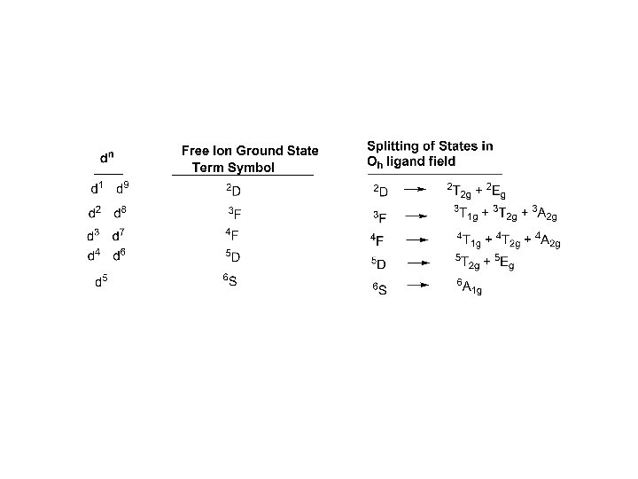 Splitting of the weak field dn ground state terms in an octahedral ligand field Ground state determined by inspection of degeneracy of terms for given dn
