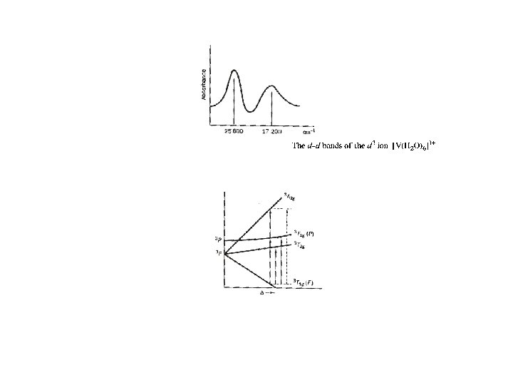 Typical Δo and λmax values for octahedral (ML 6) d-block metal complexes _________________________________ Complex Δo cm-1 ~ λmax (nm) Complex Δo cm-1 λmax (nm) __________________________________________ [Ti(H 2 O)6]3+ 20, 300 493 [Fe(H 2 O)6]2+ 9, 400 1064 3+ [V(H 2 O)6] 20, 300 493 [Fe(H 2 O)6]3+ 13, 700 730 2+ 3[V(H 2 O)6] 12, 400 806 [Fe(CN)6] 35, 000 286 [Cr. F 6]315, 000 667 [Fe(CN)6]433, 800 296 [Co(H 2 O)6]3+, l. s. 20, 700 483 [Fe(C 2 O 4)3]314, 100 709 [Cr(H 2 O)6]2+ 14, 100 709 [Co(CN)6]3 - l. s. 34, 800 287 [Cr(H 2 O)6]3+ 17, 400 575 [Co(NH 3)6]3+ l. s. 22, 900 437 3+ [Cr(NH 3)6] 21, 600 463 [Ni(H 2 O)6]2+ 8, 500 1176 [Cr(en)3]3+ 21, 900 457 [Ni(NH 3)6]2+ 10, 800 926 32+ [Cr(CN)6] 26, 600 376 [Ni(en)3] 11, 500 870 __________________________________________