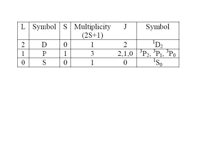 Spectroscopic Description of Atomic Electronic States – Term Symbols Multiplicity (2 S +1) describes the number of possible orientations of total spin angular momentum where S is the resultant spin quantum number (1/2 x # unpaired electrons) Resultant Angular Momentum (L) describes the coupling of the orbital angular momenta of each electron (add the m. L values for each electron) Total Angular Momentum (J) combines orbital angular momentum and intrinsic angular momentum (i. e. , spin). To Assign J Value: if less than half of the subshell is occupied, take the minimum value J =|L−S|; if more than half-filled, take the maximum value J = L + S; if the subshell is half-filled, L = 0 and then J = S.