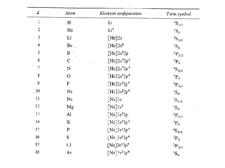 Electronic States of Atoms Quantum numbers for electrons Quantum numbers for many-electron atoms l: orbital angular momentum quantum number (0, 1, … n-1 where 0=s, 1=p, 2=d, 3=f) L: orbital angular momentum quantum number ml: orbital magnetic quantum number (l, l-1, …, 0, …, -l ) ML: orbital magnetic quantum number (Sml) 2 L+1 possible values s: electron spin quantum number (1/2) S: total spin quantum number S = s 1+s 2, s 1+s 2 -1, …, | s 1 -s 2 | S = 0 singlet, S = 1 doublet, S = 2 triplet ms: spin magnetic quantum number (+1/2, -1/2) MS: spin magnetic quantum number (Sms) 2 S+1 possible values e. g. , for 2 e-: L = l 1+l 2, l 1+l 2 -1, l 1+l 2 -2, …, | l 1 -l 2 | 0 = S, 1 = P, 2 = D, 3 = F J: total angular quantum number J = L+S, L+S-1, …, | L-S|
