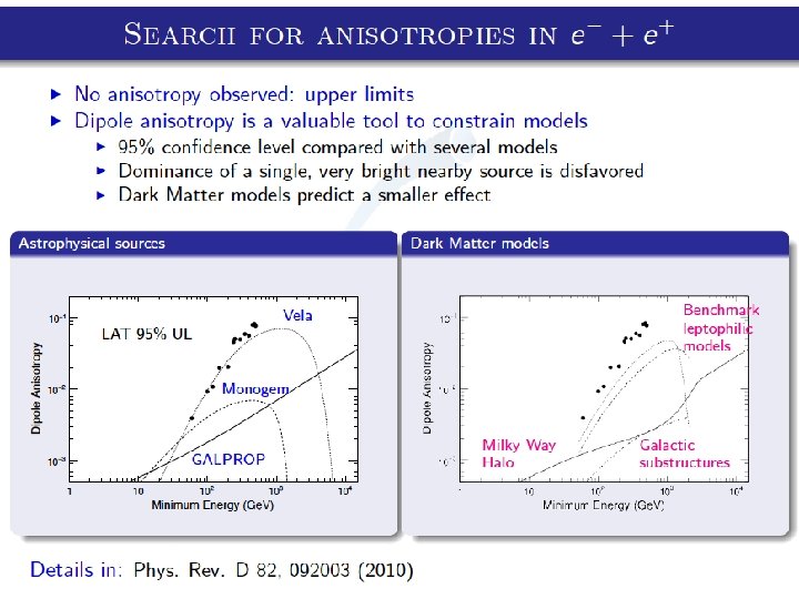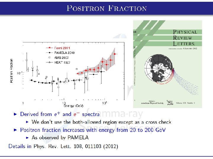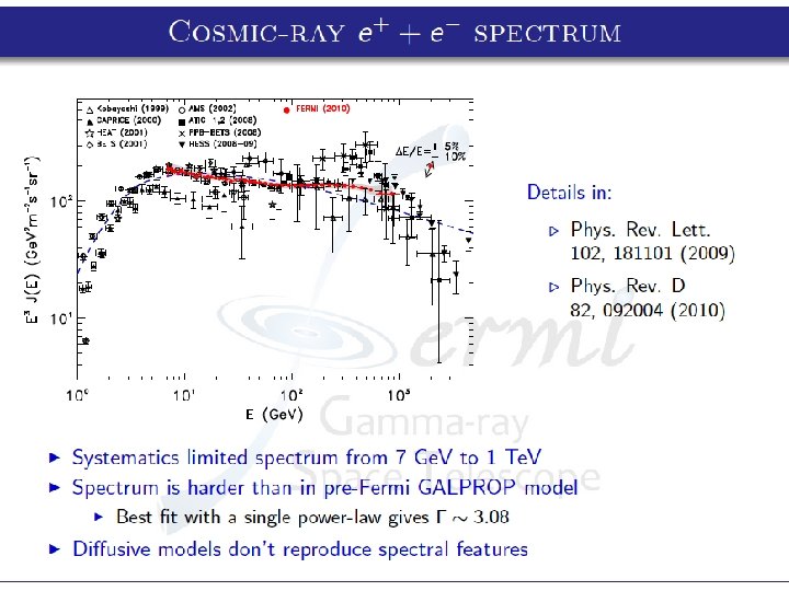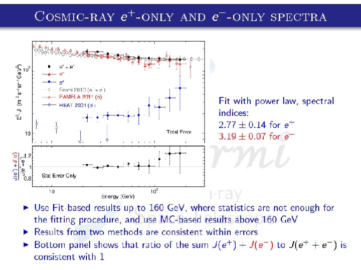 PAMELA & FERMI • Same trend for positrons (increasing with energy) • Compatible spectral indexes for electrons and positrons : PAMELA : FERMI: = 3. 18 ± 0. 04 for electrons = 2. 70 ± 0. 15 for positrons = 3. 19 ± 0. 07 for electrons = 2. 77 ± 0. 14 for positrons