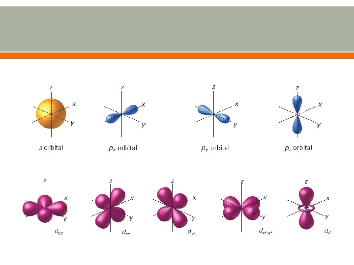 Atomic Orbitals Region of space in which there is a high probability of finding an electron Orbitals are found within each energy level Energy levels are also called principal quantum numbers (n) o n=1, n=2, n=3, up to n=7 Each energy sublevel corresponds to an orbital of a different shape, which describes where the electron is likely to be found o s orbital: spherical o p orbital: dumbbell-shaped o d orbital: clover leaf shape o f orbital: more complicated