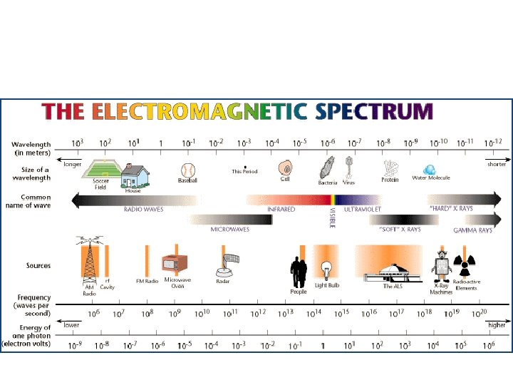 Electromagnetic Spectrum • Aka EM Spectrum • Encompasses all forms of electromagnetic radiation – The only differences in the types of radiation being their wavelengths and frequencies