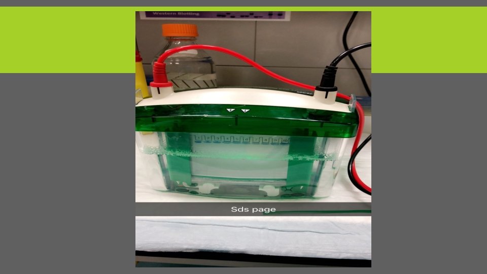 START ELECTROPHORESIS 1. Put SDS dye. In 1 st well 2. Load the samples. 3. Put the running buffer. 4. Start the electrical field for 5 min. & 50 Volt to line up all the samples at same level. (Function of Stacking gel) 5. then, adjust the machine into 40 min & 150 Volt to start separation. 6. Fixation the gel( methanol + acetic acid) for 15 min. 7. Stain with Colloidal Coomassie stain for 1 hr. 8. De-stain with 100 DW for 15 min then change the water. Repeat for 4 times or keep for overnight. 9. Take pic. by software.