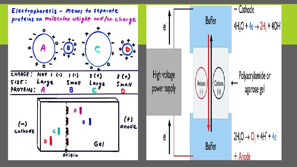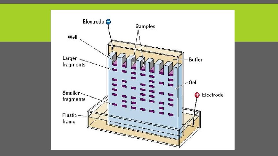 PRINCIPLES OF ELECTROPHORESIS § Electrophoresis is a method used to separate charged particles from one another based on differences in their migration speed according in to there charge and size(m. wt). § This is achieved by moving negatively charged molecules (protein and nucleic acid) through a matrix (support medium )with an electric field. § Smaller molecules move faster and migrate farther than bigger ones.