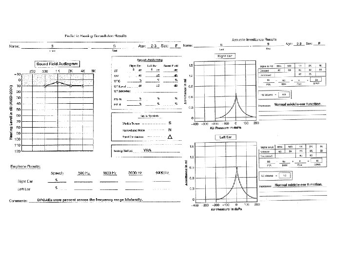 Tympanogram type? Acoustic thresholds? OAE results? Expected type of hearing loss? ECV? Normal? Static Compliance? Normal?
