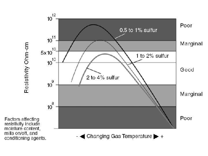 Resistivity of dust 1. When dust resistivity drops below this range, the dust releases its charge readily to the collecting surface. As a result, the dust migrates to the collecting plates where it immediately loses its charge. The charge in conjunction with the cohesive nature of the dust keeps the dust on the collecting plates. If the charge is lost, the dust is likely to be re-entrained back into the gas stream. • high resistivity dust retains charge for extended periods. the high resistivity dust deposits on the collecting plates, charge does not dissipate. As a result, high resistivity dust is very difficult to remove from the collecting plates. It is not uncommon for high resistivity dust applications to require periodic manual cleaning to restore precipitator performance.