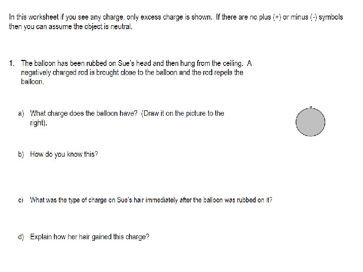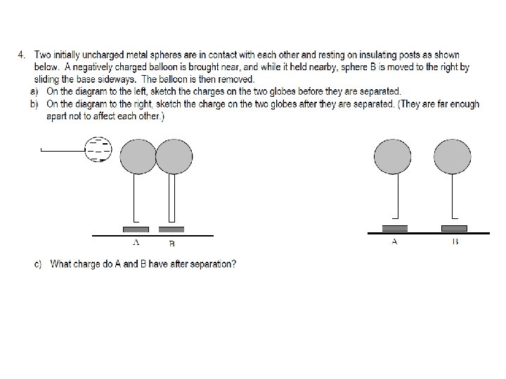 Try this… • On two occasions, the following charge interactions between balloons A, B and C are observed. In each case, it is known that balloon B is charged negatively. Based on these observations, what can you conclude about the charge on balloon A and C for each situation. positive or neutral negative positive (if it was neutral it wouldn’t repel C) positive
