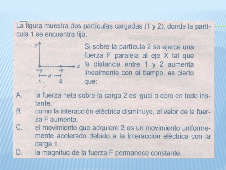 Ejemplo 2 Tres cargas q 1, q 2 y q 3 están colocadas en los vértices de un triángulo equilátero. Calcular la fuerza resultante que actúa sobre la carga q 2 , sí q 1=2 X 10 -6 C, q 2= - 3 X 10 -6 C, q 3= - 3 X 10 -6 C y r = 1 m. Q 3 F 21 Fr Q 1 Q 2 F 23