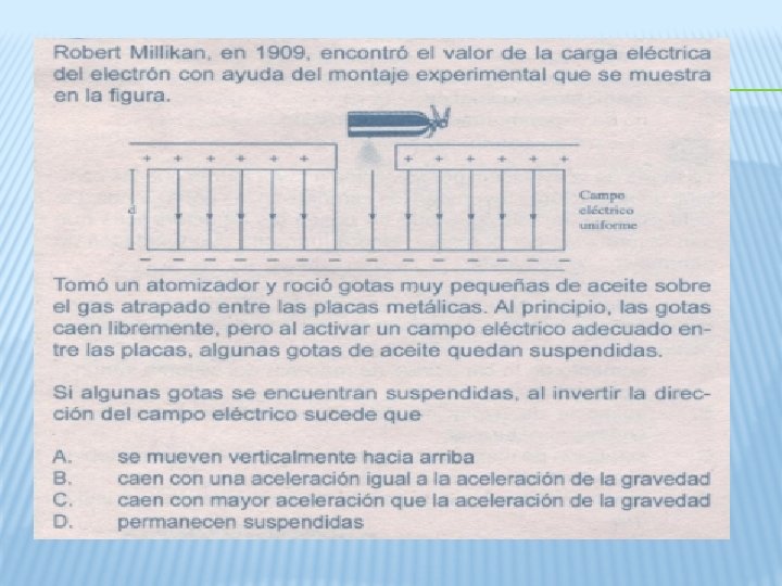 Unidades de la constante k: Sistema internacional: Sistema C. G. S: Cuantización de una carga: Puede considerarse como un exceso de partículas electrizadas con un signo dados (electrón o protón). Millikan logró demostrar experimentalmente que la carga de un electrón (e) es: Ejercicios Tres cargas q 1, q 2 y q 3 se encuentran sobre una misma recta como lo indica la figura. Calcular la fuerza electrostática ejercida sobre q 3, sí q 1=3 X 10 -7 C, q 2= - 2 X 10 -7 C, q 3=4 X 10 -7 C, r 1= 0, 1 m y r 2= 0, 2 m. 0, 1 m Q 1 Q 2 0, 2 m Q 3 Q 1 Q 2 F 32 Q 3 F 31