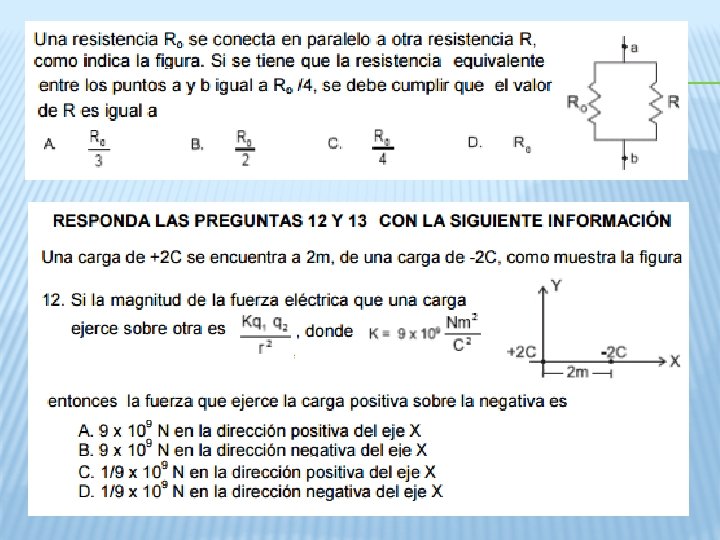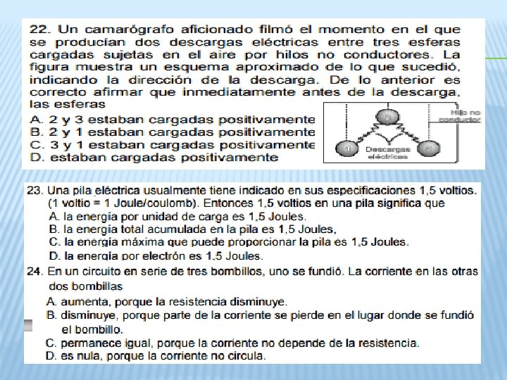 • Una bombilla consume una potencia de 60 W, cuando se conecta a una diferencia de potencial de 150 V. La corriente que circula es de: a) 2, 5 A b) 0, 4 A c) 90 A d) 9000 A. • Un alambre de cobre ( ρ = 1, 7 x 10 -8 Ωm ) de 120 m de longitud tiene una de 8, 5 Ω. El área de su sección transversal es: a) 0, 24 x 10 -8 m 2 b) 24 x 10 -8 m 2 c) 2, 4 x 10 -8 m 2 d) 240 x 10 -8 m 2 • La resistencia de un conductor para el que circula una corriente de 0, 6 A, cuando es sometido a una diferencia de potencial de 48 V es de: a) 28, 8 b) 0, 01. c) 80 d) 47, 4 • Una lámpara de 100 W trabaja a 110 V, la intensidad de corriente que fluye es de: a) 1, 1 A b) 0, 9 A c) 1, 1 x 104 A d) 10 A • Un televisor funciona a 110 V y tiene una resistencia de 10 Ω. La carga que circula por él en 60 segundos es: a) 1, 83 C b) 11 C c) 660 C d) 6, 6 x 104 C