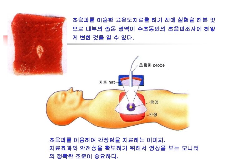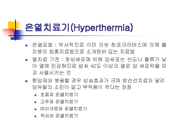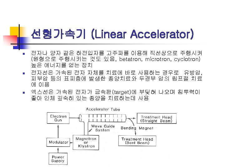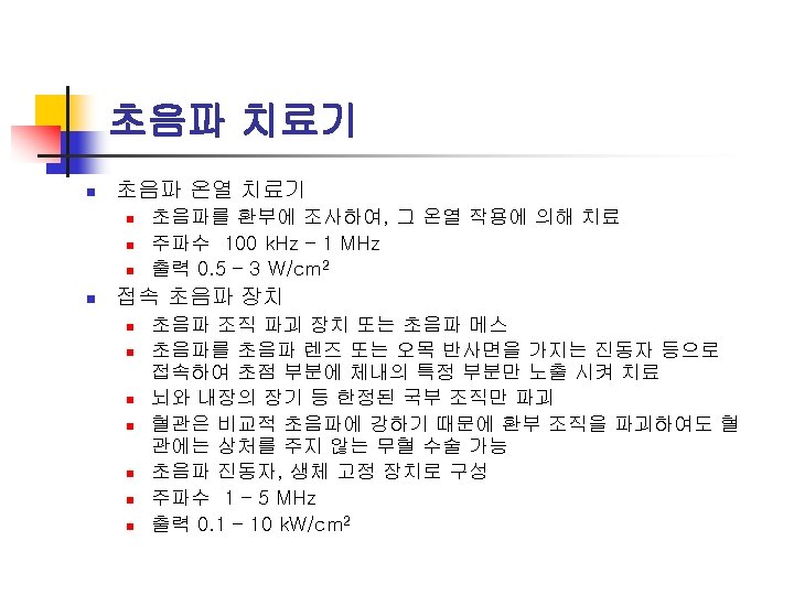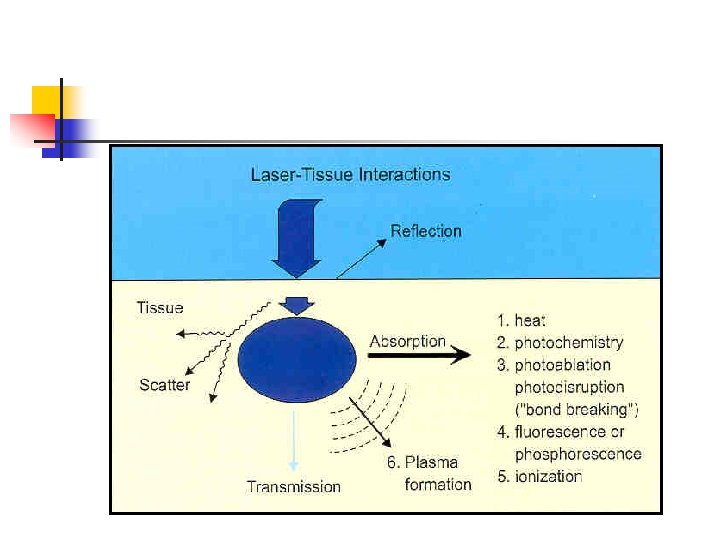 n Structure of Laser system n n Laser head : a resonator tube containing a laser medium, an excitation source, an aiming beam Support elements : a power amplifier, a cooler, and a transmitter Delivery systems : an optical fiber, an articulated arm Lasers in Medicine n Chemical-metabolic effects (low power) n Thermal destruction (high power) n Non-thermal mechanical destruction (very high power)