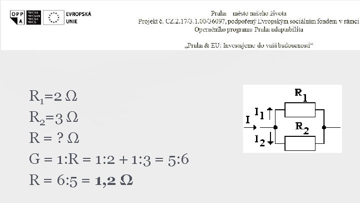 Rezistory II - paralelně zapojené • • • všude stejné U I = I 1+I 2 (každý elektron projde jen jedním rezistorem) podle Ohmova zákona I I = U: R 1+U: R 2 = U: R 1+1: R 2 = 1: R = G 1+G 2 = G I: I 1: I 2 = G: G 1: G 2 Převrácená hodnota celkového odporu je rovna součtu převrácených hodnot jednotlivých rezistorů.