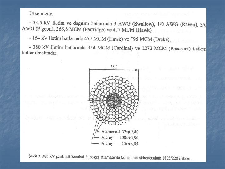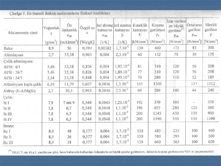 İLETKENLER Kullanılan iletken malzemeler: TS 3 : Hava hatlarında kullanılan örgülü bakır iletken TS 490 : Çelik özlü Alüminyum iletkenler TS 730 : Çelik özlü alüminyum iletkenlerde kullanılan çinko kaplı çelik tel İletkenlerde aranan başlıca özellik, iletkenliğin iyi ve çekme dayanımının büyük olmasıdır. Bakır pahalı olduğundan çoğunlukla alüminyum iletken kullanılır.