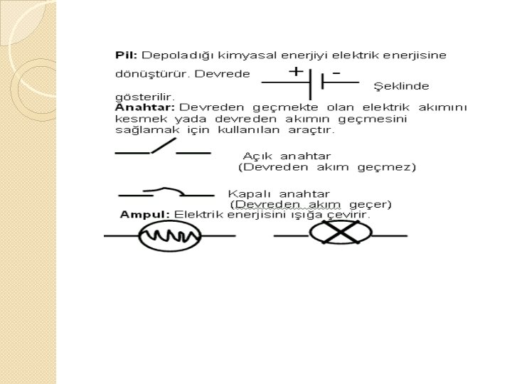 Devre Elemanları �Pil, ampul, anahtar, kablo. �- Devre elemanları 2 kutupludur.