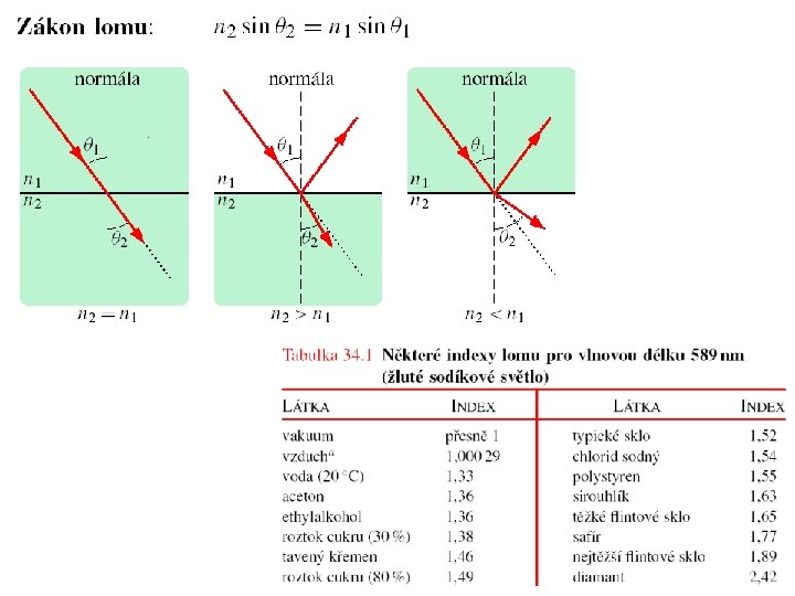 Zákony odrazu a lomu Vlnové vektory dopadající, odražené a lomené vlny leží v jedné rovině (tzv. rovině dopadu). V této rovině také leží normála k rozhraní. (zákon odrazu) (zákon lomu, Snellův zákon)